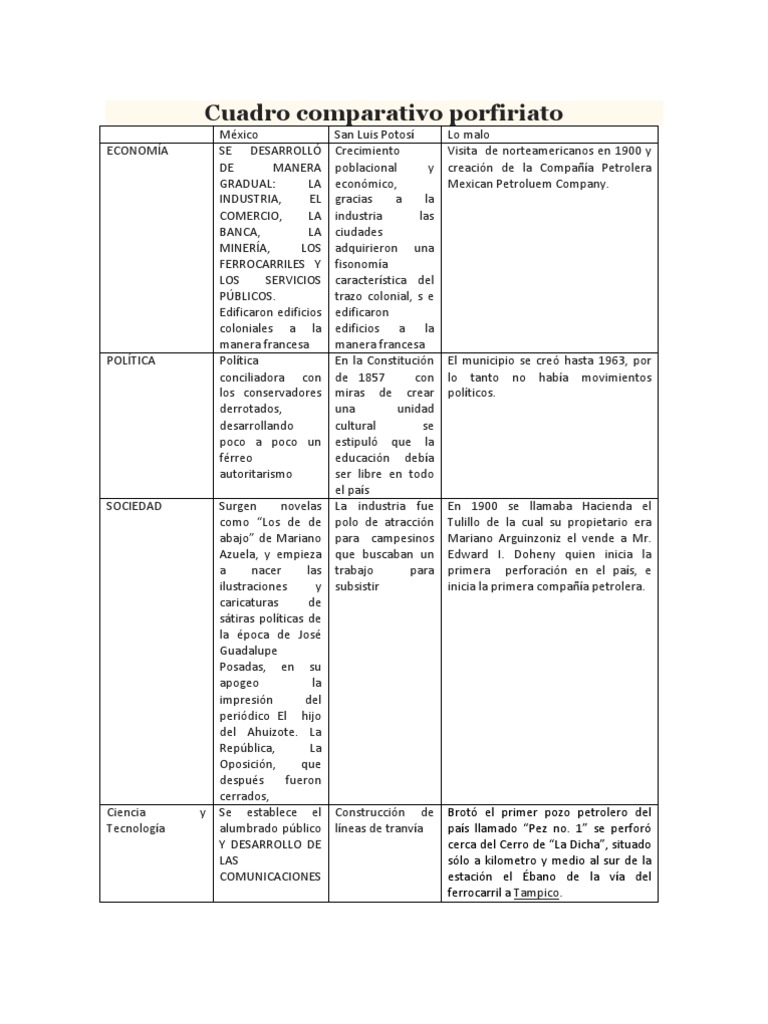 Cuadro comparativo del porfiriato ~ ECONOMA Mxico SE DESARROLL DE MANERA GRADUAL. Gobiernos pos revolucionarios cuadro comparativo 1. Indeed recently is being searched by users around us, maybe one of you personally. Individuals now are accustomed to using the internet in gadgets to see video and image information for inspiration, and according to the title of this article I will talk about about Cuadro Comparativo Del Porfiriato El Porfiriato Ventajas En los 31 años del Porfiriato se construyeron en México más de 19 000 kilómetros de vías férreas con la inversión extranjera.